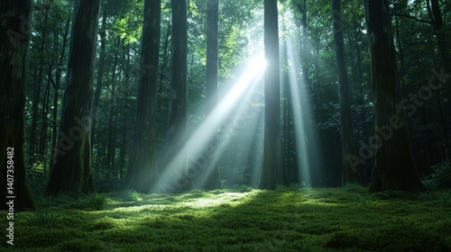 © h4kunA, Obraz premium Sunlight beams through mossy forest floor