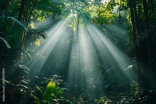 © armaya, Obraz premium Sunlight beams through rainforest canopy