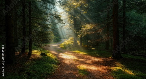 Obraz premium Sunlight beams through serene forest path, illuminating greenery