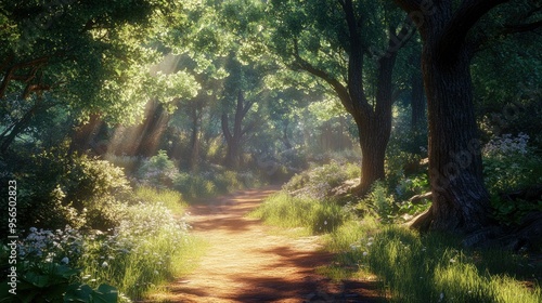 © BozStock, Obraz premium Sunlight beams through the trees as a path winds through the woods.