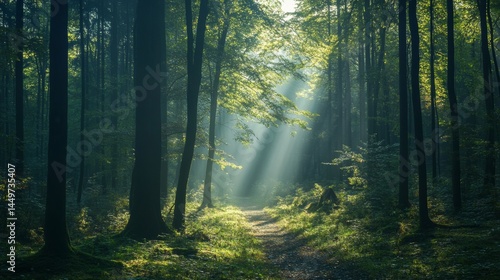 © Crafted, Fototapeta premium Sunlight beams through the trees in a dense green forest.