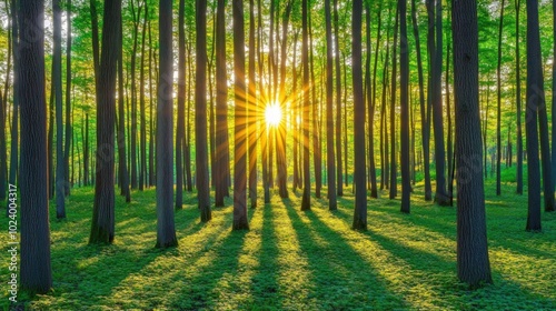 Fototapeta premium Sunlight beams through the trees in a lush forest.