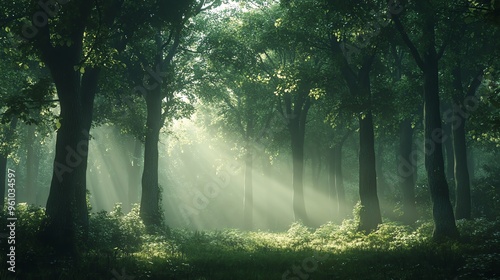 Fototapeta premium Sunlight beams through the trees of a misty forest.