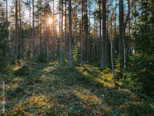 © Caterina, Obraz premium Sunlight beautiful green forest with pine trees in Sweden.