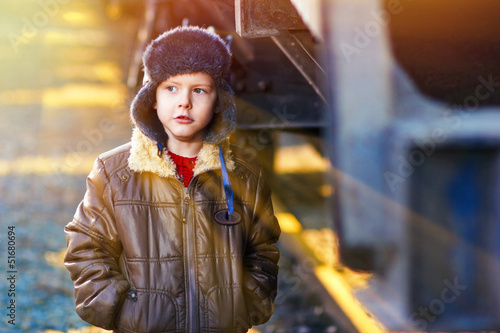 Fototapeta premium sunlight Boy homeless bum on street freezing close to railway ca