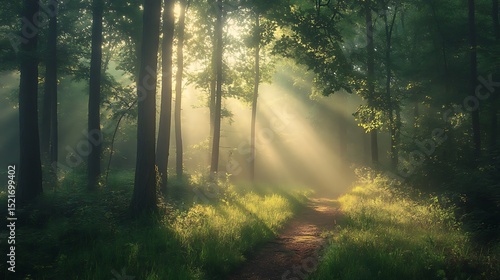 Naklejka premium Sunlight breaking through a misty forest, illuminating a tranquil pathway.