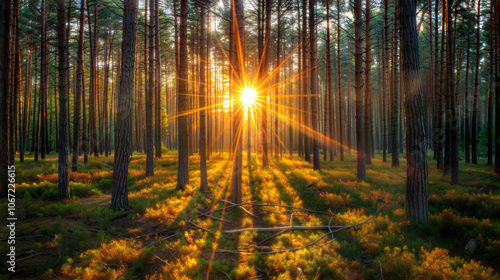 Naklejka premium Sunlight breaking through pine trees in a tranquil forest landscape