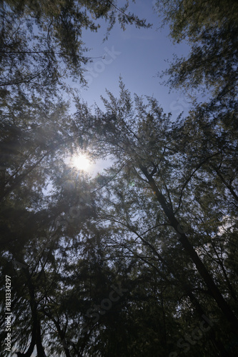 © AK ST, Fototapeta premium Sunlight Breaking Through Tree Canopy in Dense Forest Scene