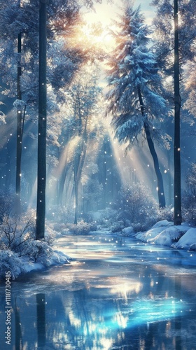 Naklejka premium Sunlight breaks through the tall, frosted trees, casting a soft glow over a tranquil stream. Snowflakes dance in the air, completing this enchanting winter morning tableau