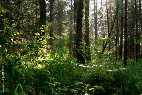 © Lema-lisa, Obraz premium sunlight breaks through the tree branches in the dense wild forest