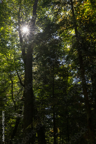 © kburgess, Obraz premium Sunlight bursting through trees in dark forest