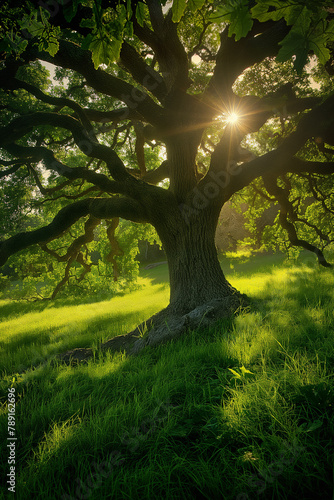 Fototapeta premium Sunlight bursts through the sprawling branches of an ancient tree, illuminating the verdant grass and roots, embodying the tree’s enduring life force.
