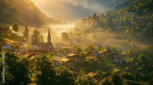 © Lakkhana, Fototapeta premium Sunlight casting a warm glow on a picturesque village