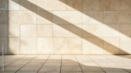 © mknisanci, Fototapeta premium Sunlight Casting Geometric Shadows on Beige Stone Wall