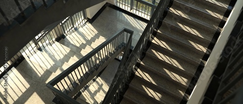 Obraz premium Sunlight Casts Repeating Grid Shadows Across Stairwell, Crisp Rails And...