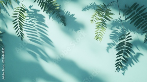 © BerkahStock, Obraz premium Sunlight casts shadows of green leaves on a teal background.