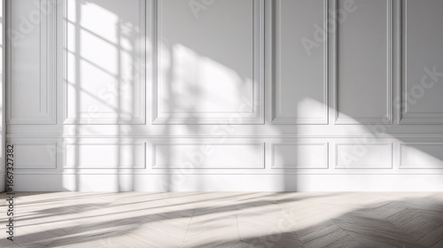 © Koplexs-Stock, Obraz premium Sunlight casts shadows on a white wall with decorative molding in an empty room.