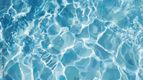 Fototapeta premium Sunlight dances on crystalline pool water, creating mesmerizing ripple patterns. Light blue hues dominate, evoking calm and serenity. Top-down view highlights texture. Neural network AI generated