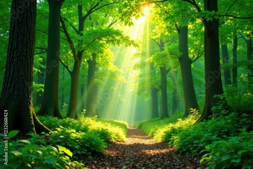 Obraz premium Sunlight dappled forest floor, vibrant green leaves , ecology, bright