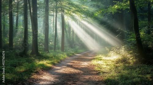 © Kopgz-41, Fototapeta premium Sunlight Dappled Forest Trail: A Tranquil Escape