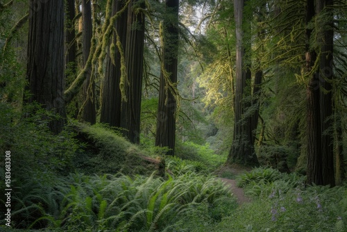 © Ruhel, Obraz premium Sunlight Dappled Path Lush Green Moss Redwood Forest Ferns Undergrowth Ancient Trees image
