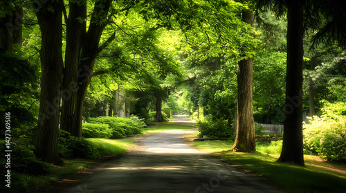 © artzone, Obraz premium Sunlight Dappled Path Through Lush Green Forest
