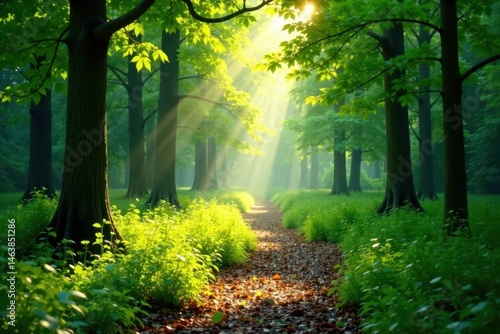 Obraz premium Sunlight dappled path through lush green forest, path, canopy