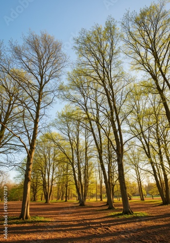 Obraz premium Sunlight Dappled Spring Forest with Tall Trees