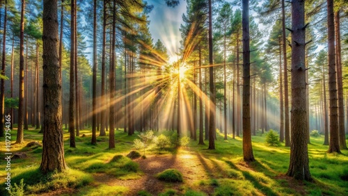 Obraz premium Sunlight Dappled Through a Forest of Tall Trees, Casting Long Shadows on the...