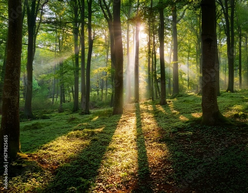 © Erik, Fototapeta premium sunlight dappled through forest trees nature photography