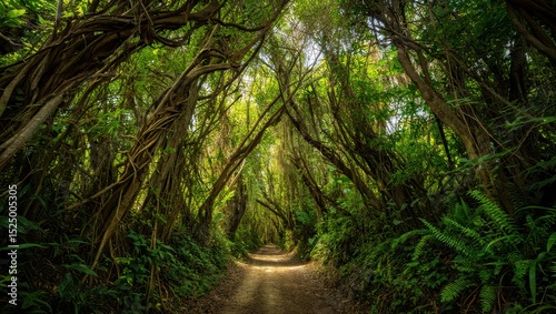 © Fatema SF, Obraz premium Sunlight dapples a path winding through a dense, verdant forest canopy