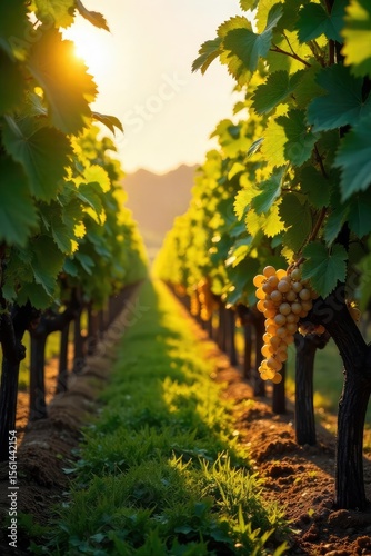 Naklejka premium Sunlight dapples rows of ripening grapes hanging heavy on the vine in a picturesque vineyard, ready for harvest Golden hour illuminates the lush landscape , vineyard, picturesque, harvest
