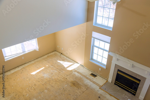 Obraz premium Sunlight enters through windows in living room where floors are bare renovation work is ongoing.