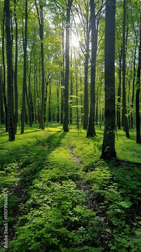 Obraz premium Sunlight filtered gently through the lush green forest, casting soft beams on the forest floor.