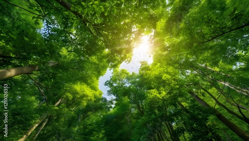 Fototapeta premium Sunlight Filtered Through Green Canopy, Forest Trees Nature Background
