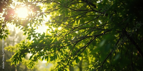 Obraz premium Sunlight filtering through a canopy of green leaves, creating a dappled...