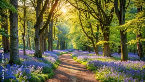 © A.Rod, Naklejka premium Sunlight filtering through a canopy of green leaves illuminating a path lined with vibrant blue wildflowers