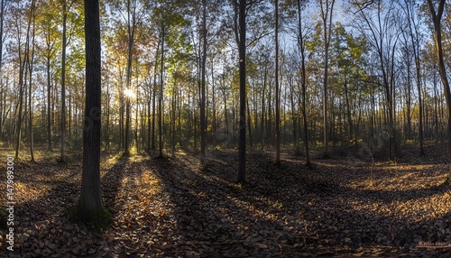 Obraz premium Sunlight filtering through a dense autumn forest.