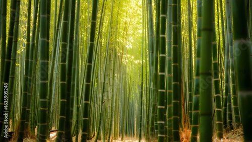 Fototapeta premium Sunlight filtering through a dense bamboo forest creating a serene natural landscape