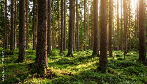 © Brogar, Fototapeta premium Sunlight filtering through a dense coniferous forest (1)