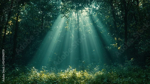 © Jolodong, Obraz premium Sunlight filtering through a dense forest.