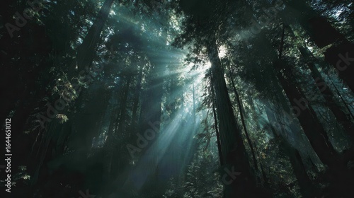 © Ariestia, Obraz premium Sunlight filtering through a dense forest.