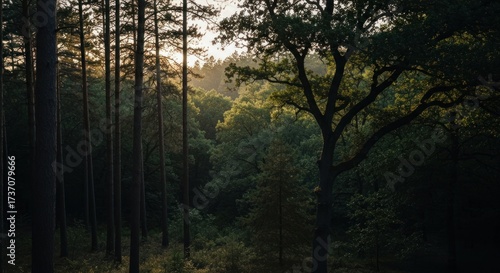 Obraz premium Sunlight filtering through a dense forest