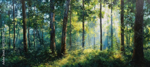 Obraz premium Sunlight filtering through a dense forest
