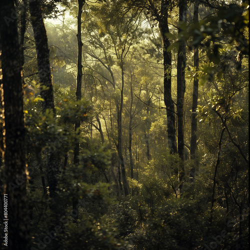 Obraz premium Sunlight Filtering Through a Dense Forest