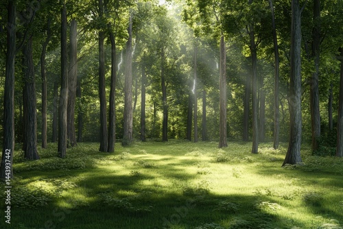 © RizArt, Obraz premium Sunlight filtering through a dense forest canopy.