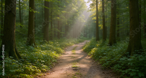 Obraz premium Sunlight Filtering Through a Dense Forest Canopy Illuminating a Dirt Path