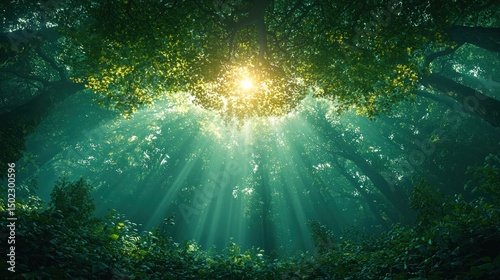 Fototapeta premium Sunlight filtering through a dense forest canopy. Lush greenery and vibrant light create a mystical atmosphere