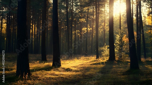 Obraz premium Sunlight filtering through a dense forest, casting long shadows on the forest...