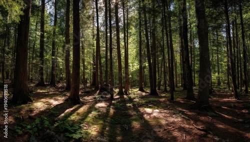 © Daeng, Obraz premium Sunlight filtering through a dense forest creating dramatic shadows on the ground.
